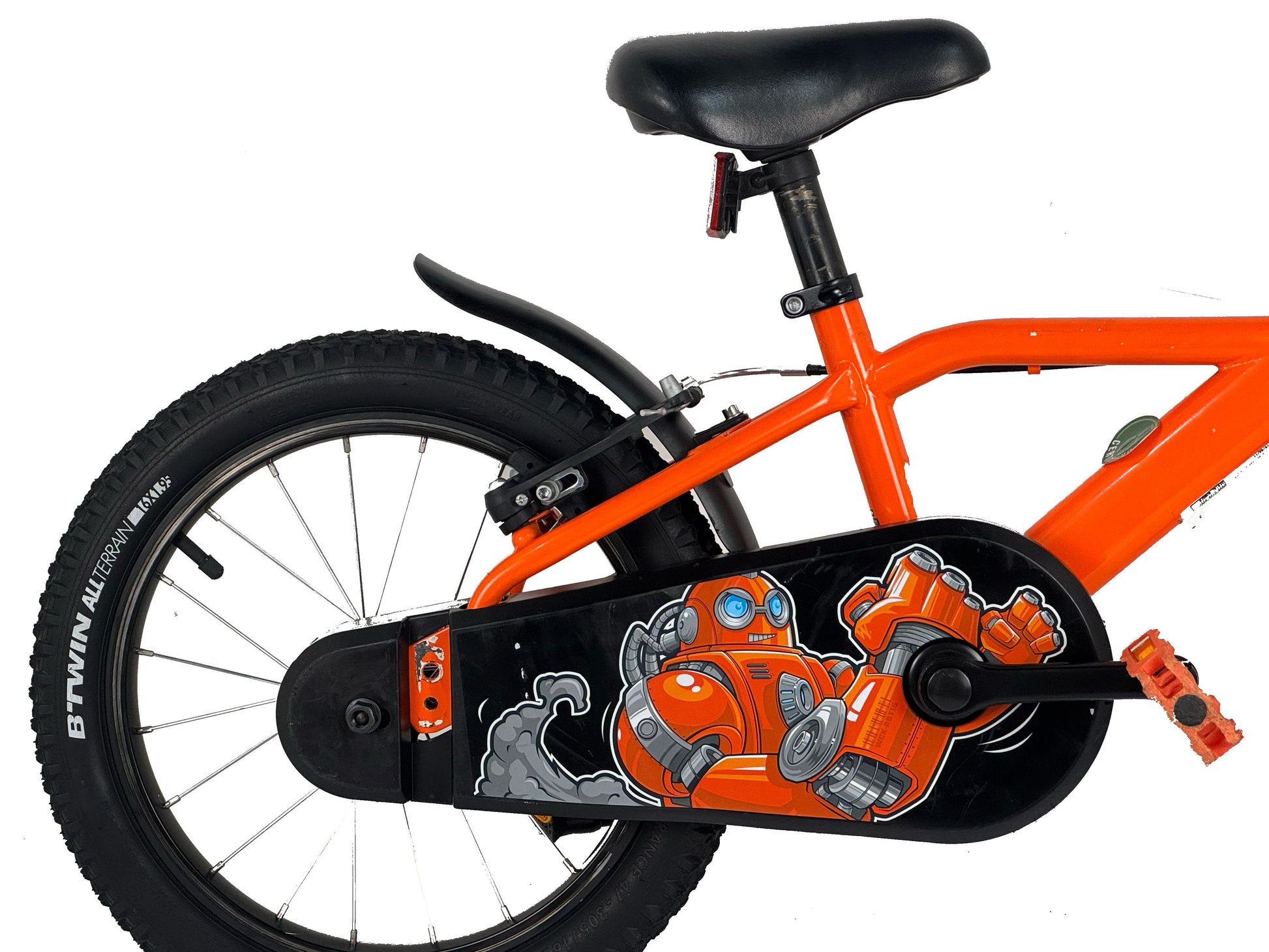 Bicicleta de 16" con salpicadera, caballete, neumáticos taqueados y timbre. Frenos adaptados a las manos de los niños y cubrecadena envolvente para circular con total seguridad.